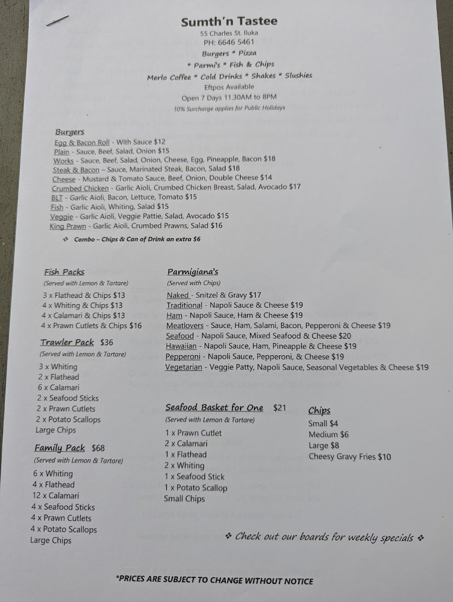 The menu at Sumth'n Tastee On Charles offers a satisfying variety of options, with something to suit all tastes. For burger lovers, the choices include the Egg & Bacon Roll, Plain, Works, Steak & Bacon, and Cheese burgers, each offering a unique twist on classic favorites. If you're in the mood for something hearty, their Parmigiana's menu features a selection of flavors, including the Traditional, Ham, Meatlovers, Seafood, and Hawaiian varieties, ensuring there's a perfect combination for everyone. With these delicious options, Sumth'n Tastee On Charles serves up a comforting and diverse menu, promising a satisfying meal for all who visit.